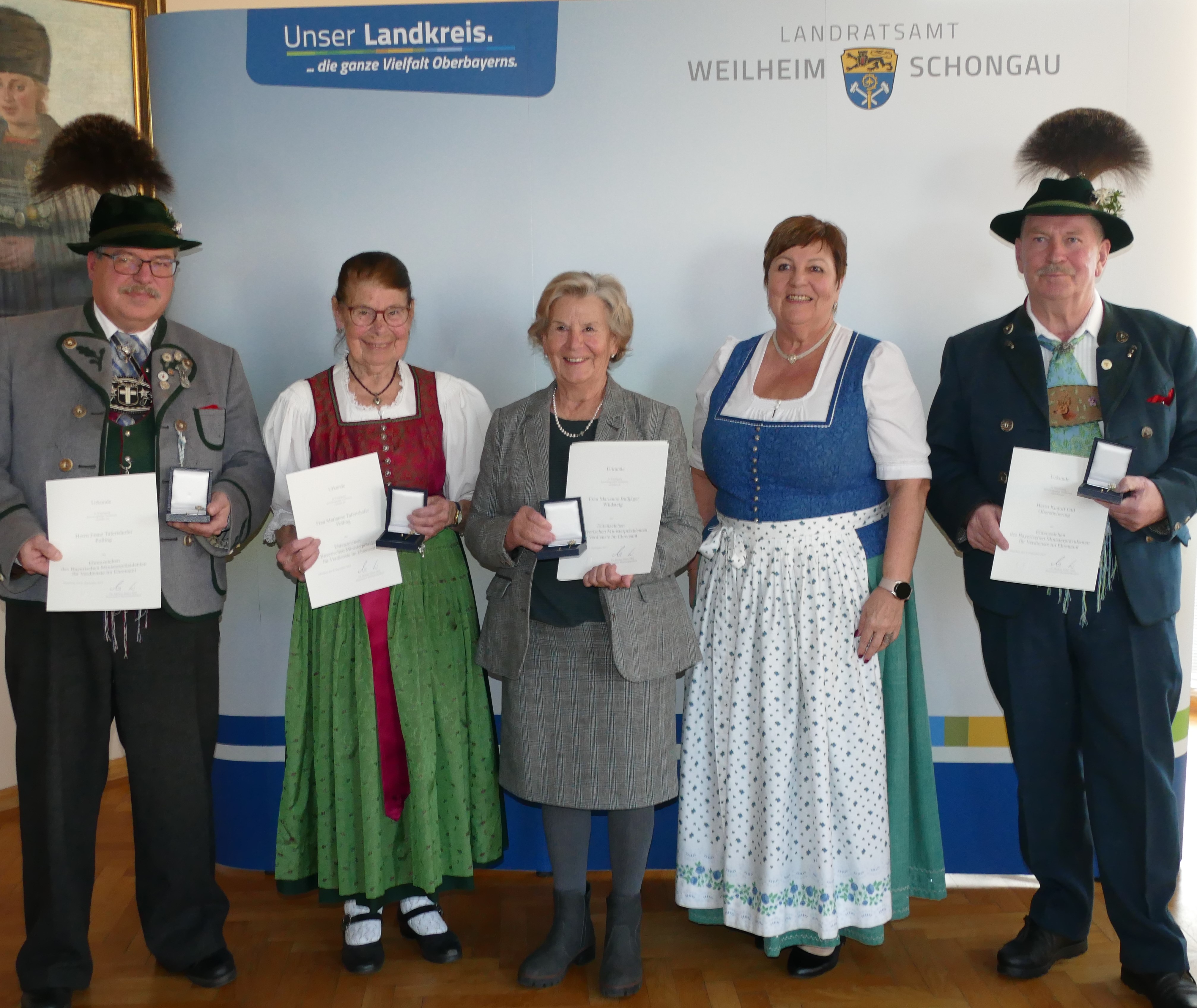 Im Landratsamt in Weilheim wurden Marianne Bußjäger aus Wildsteig, Marianne und Franz Tafertshofer aus Polling und Rudolf Ottl aus Obersöchering für ihr langjähriges ehrenamtliches Wirken mit dem Ehrenzeichen des Bayerischen Ministerpräsidenten ausgezeichnet.
