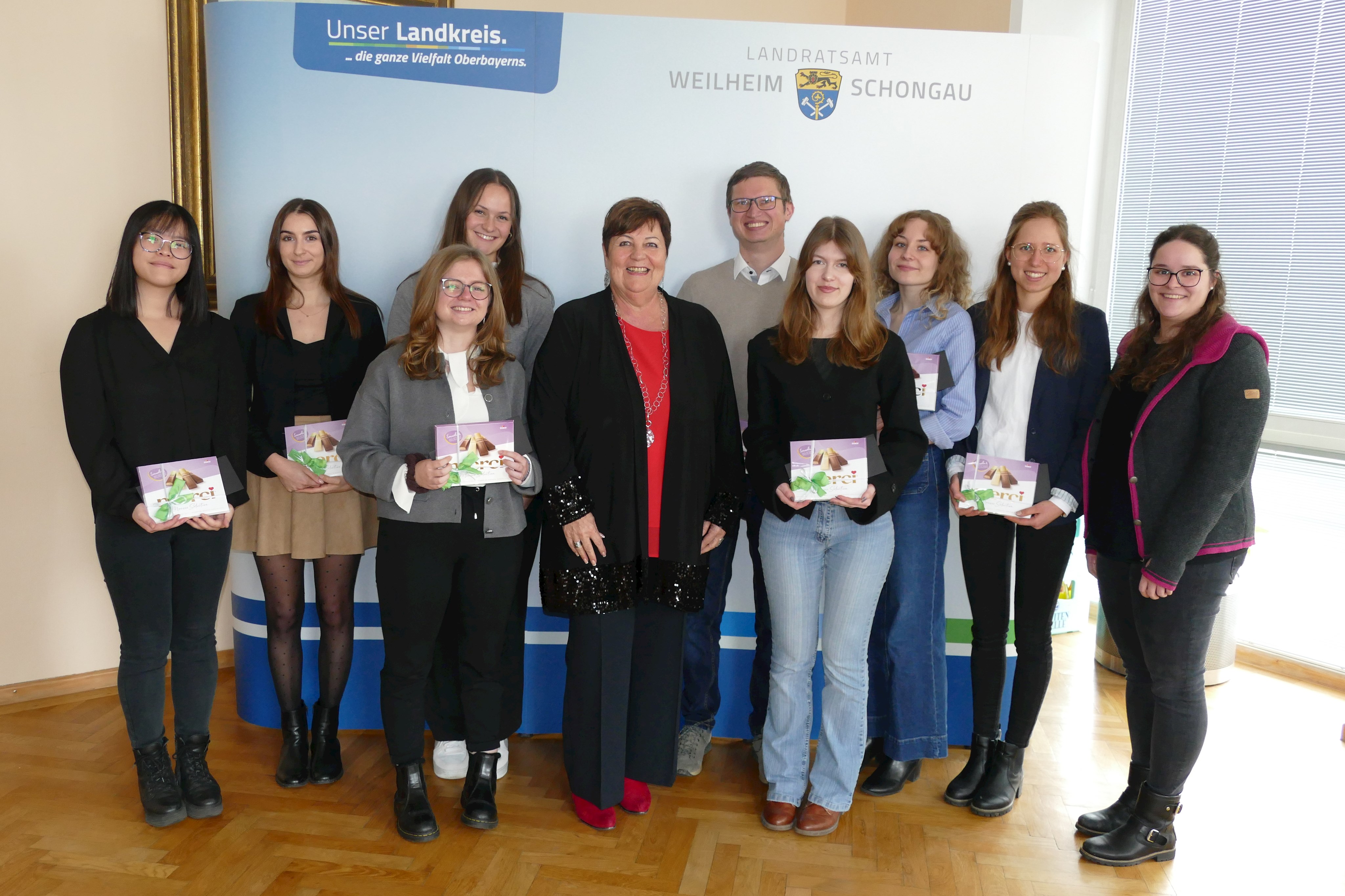 Ein besonderer Tag für den Landkreis und seine Nachwuchskräfte: Landrätin Andrea Jochner-Weiß hat insgesamt zehn Absolventinnen und Absolventen ihrer Ausbildungen und Studiengänge feierlich zu ihren bestandenen Prüfungen gratuliert. „Ich danke euch allen für euren Einsatz und freue mich, wenn ihr noch viele Jahre Teil unseres Teams bleibt“, betonte die Landrätin im Rahmen der kleinen Feierstunde.